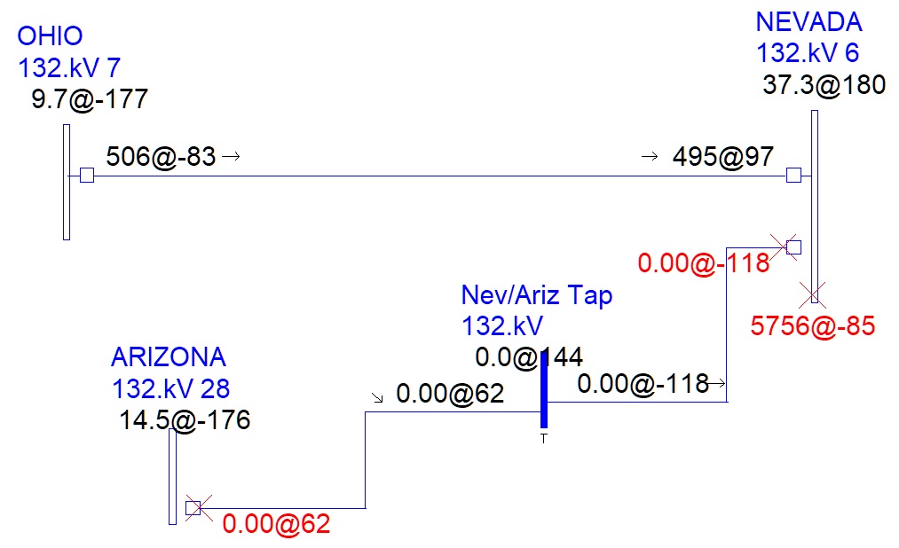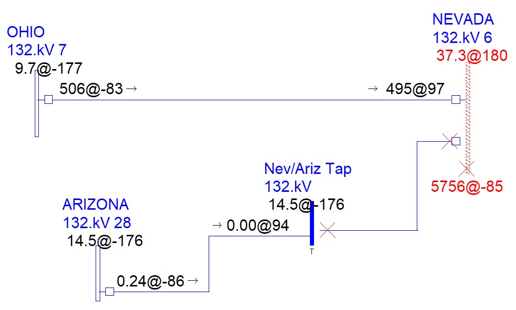 You may now press Simulate, and you will see that a Remote Bus fault (1LG) has been simulated at NEVADA with Line-End faults (3LG) at each end of the line between NEVADA and ARIZONA, effectively simulating a full line outaged and grounded at both ends.