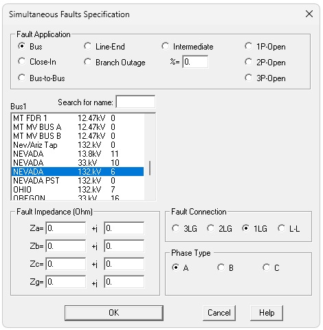 First, we add our Remote Bus fault. Choose bus, choose NEVADA (132 kV), choose 1LG, and press OK.